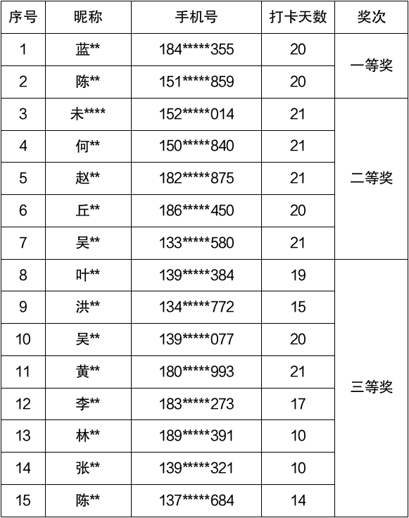 为喜迎国庆中秋双节,浓厚节日氛围,集美图书馆联合超星集团举办了“何以中国,何以你我”21天讲座打卡活动。最终,有十五位读者获得我馆相应奖品一份,获奖读者名单如下所示,快来图书馆领奖吧!